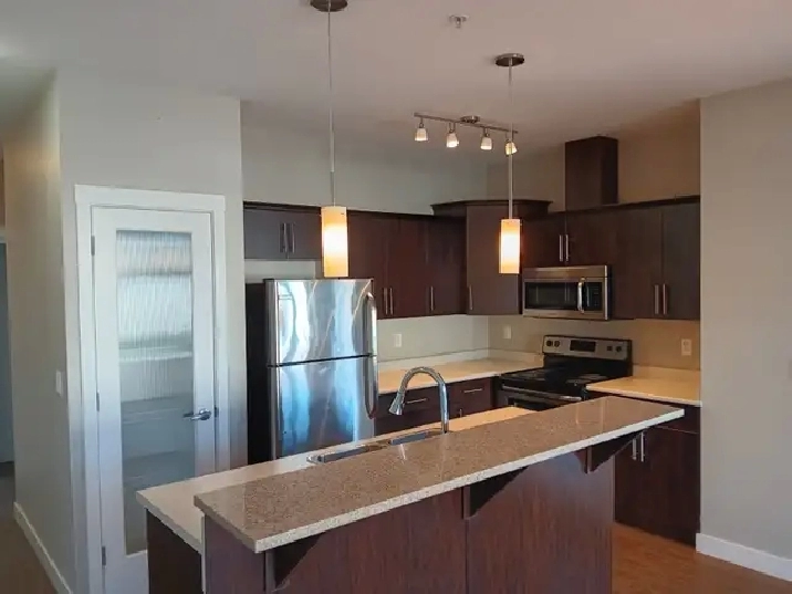 This modern corner suite includes large surrounding windows for plenty of light and fresh air, a large island with a breakfast bar, lots of cupboard space plus a pantry, walk-in closets in the master, an in-suite master bathroom with a full-size shower, a large vanity, a large balcony, and plenty of storage. In-suite high-efficiency appliances, including a full fridge, dishwasher, washer & dryer. Electric heating. One free underground parking stall is included, with the option to add a second stall. Free Bike Storage. Extra storage units on-site.
