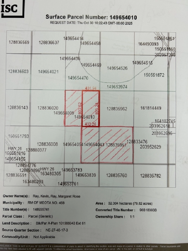 SW 26-46-17-W3, 154.39 acres, 2025 assessed at $157,500 and Block A, Plan 101566076, Ext. 62 (part SE