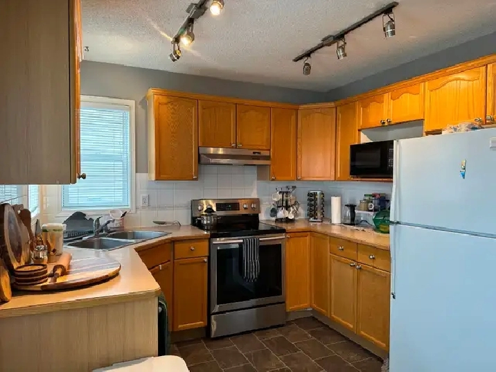 Occupancy for the 1,282-sqft 4-bed, 1.5-bath house. 2 outdoor parking spots. Central heating. Utilities excluded. Finished basement and yard included. Included appliances: fridge, stove, microwave, washer, dryer, and range hood.
