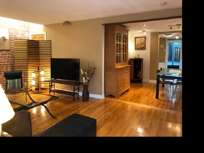 Situé au rez-de-chaussée, l’appartement est un grand 4 ½ (1 chambre à coucher fermée, un grand salon avec canapé lit en air ouverte, une cuisine et une salle à manger distincte), très lumineux entièrement meublé, avec plancher de bois franc et une MAGNIFIQUE COUR ARRIÈRE (avec meubles de patio et BBQ), qui donne accès sur une ravissante « Ruelle Verte ».
