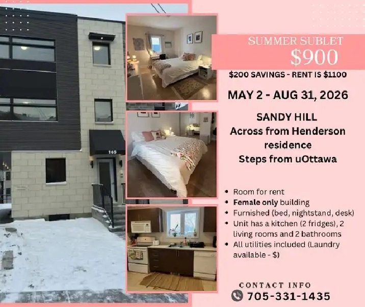 Large furnished bedroom (12x17 ft) in a clean, all-female student house located in Sandy Hill, directly across from Henderson Residence and just steps from uOttawa.